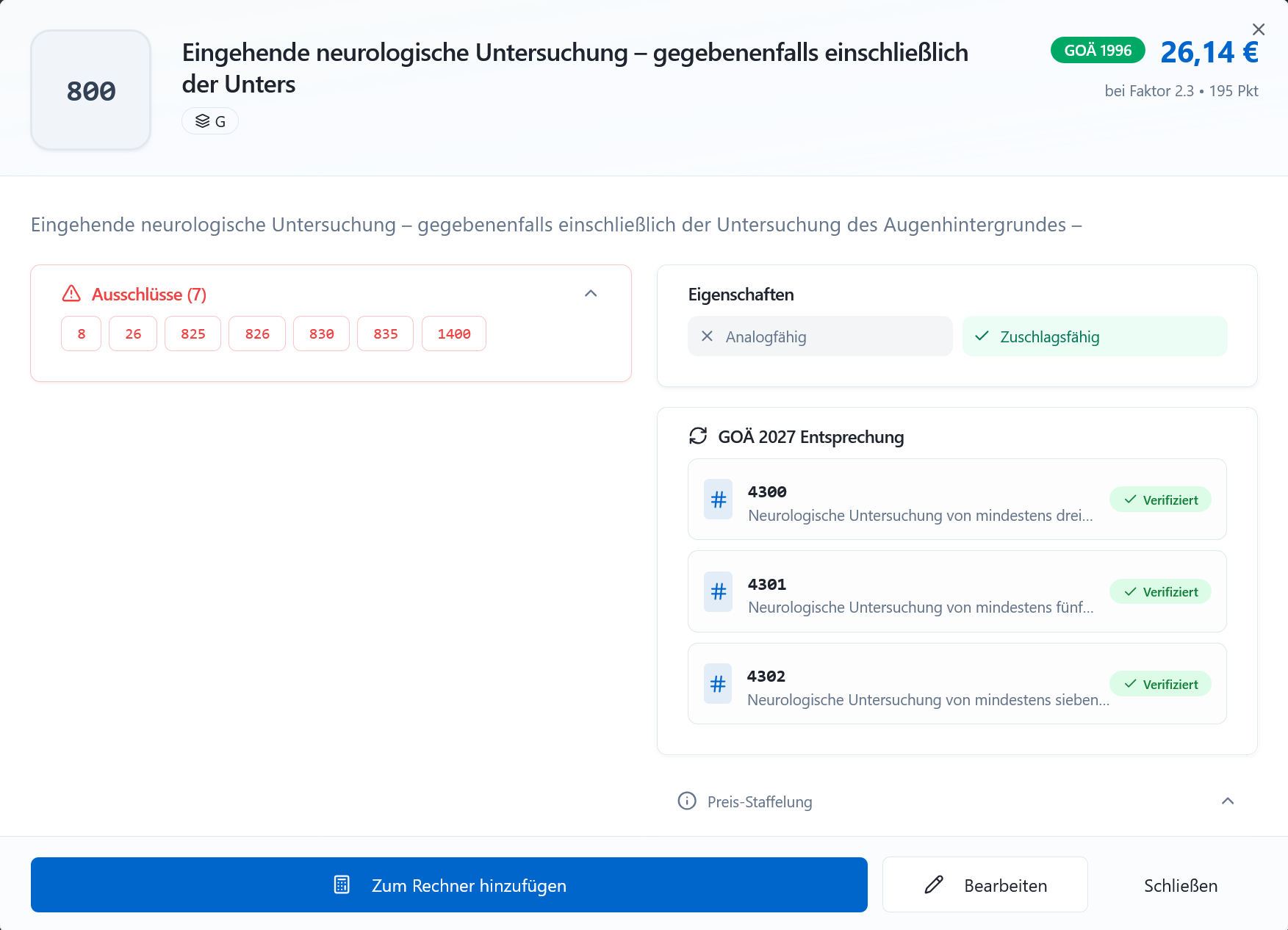- interaktive Gegenüberstellung aktuelle und neue GOÄ (gilt voraussichtlich ab 2027)